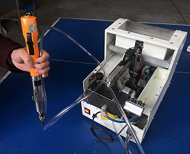 手持式鎖螺釘機是由鎖緊工具和自動送螺釘機組成,手持工具對準產品下壓鎖完一顆螺釘后,自動送釘機會快速送來下一顆螺釘入螺絲卡爪內,節省了手抓螺絲的時間。